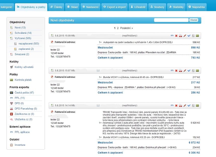 Zde máte přehled nad novými, schválenými, vyřízenými, zaplacenými, nezaplacenými a smazanými objednávkami. Můžete zde také prohlížet košíky zákazníků či kontrolovat platby nebo fronty pro jednotlivé odběrné místa. Úplně dole na této stránce se nachází i položka inventůra, kdy si uděláte přehled toho kolik jste toho prodali za Vámi zvolené období.