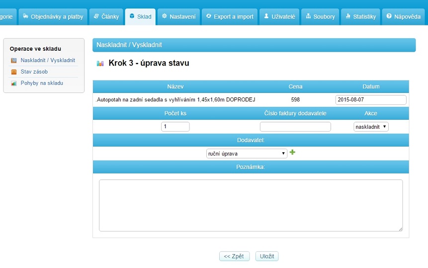 Výrobky máte vloženy, články napsané a dorazilo vám zboží od dodavatele. Pomocí skladu máte možnost se zbožím manipulovat, tedy naskladnit / vyskladnit / vrátit podle faktury dodavatele. Dále sklad nabízí kontrolu stavu zásob a nakonec také sledovat pohyb veškerého zboží.