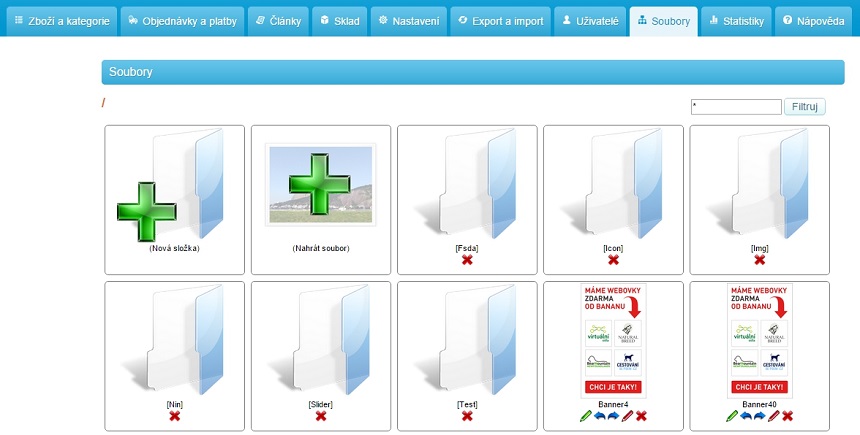 Sekce slouží pro práci se soubory. Můžete zde nahrávat/mazat soubory. Nahrávat můžete soubory různých formátů (např.: *.jpg, *.png, *.pdf, *.doc, *.xls, *.ico, *.css, *.html,).
