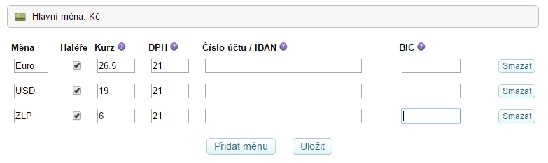 Slouží pro přidání cizích měn. Pro přidání nové měny klikněte na tlačítko Přidat.