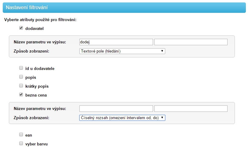 Filtrování je obsaženo dnes již skoro v každém eshopu. Vyberete si tak kritéria, podle kterých se bude zboží zobrazovat. Jednotlivé názvy (název, provedení, cena, výha, atd.) jsou názvy parametrů zboží vytvořené v sekci Nastavení -> zboží.