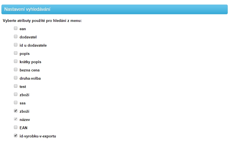 Vyhledávání obsahuje parametry zboží, podle nichž se dá zboží vyhledávat. Přidat další parametry můžete v nastavení zboží [Nastavení -> Zboží]. Jetnotlivé parametry se zobrazují právě zde a pokud je parametr zaškrtnut, bude zahrnut do vyhledávání,