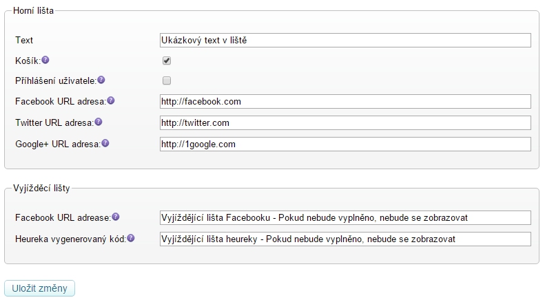 Zde lze upravovat jednotlivé informační lišty. Slouží pro přidání odkazů pro sociální sítě