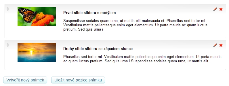 Zde přidáváte obrázky do slideshow, upravujete popisky a upravujete jejich pořadí.