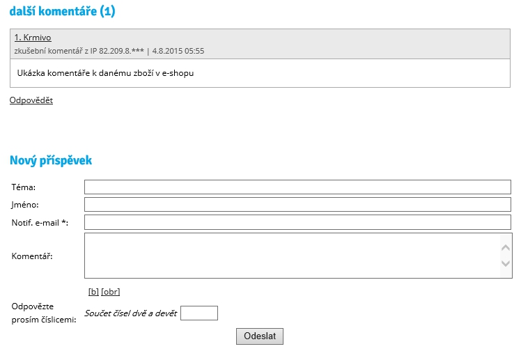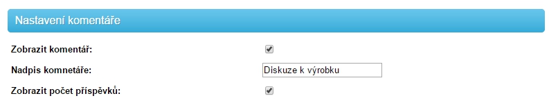 Zde můžete povolit/zakázat zobrazování komentářu u zboží, nastavit si nadpis komentáře a taky jestli se má zobrazovat počet příspvěků. V e-shopu to poté může vypadat nějak tak, jako na obrázku níže.