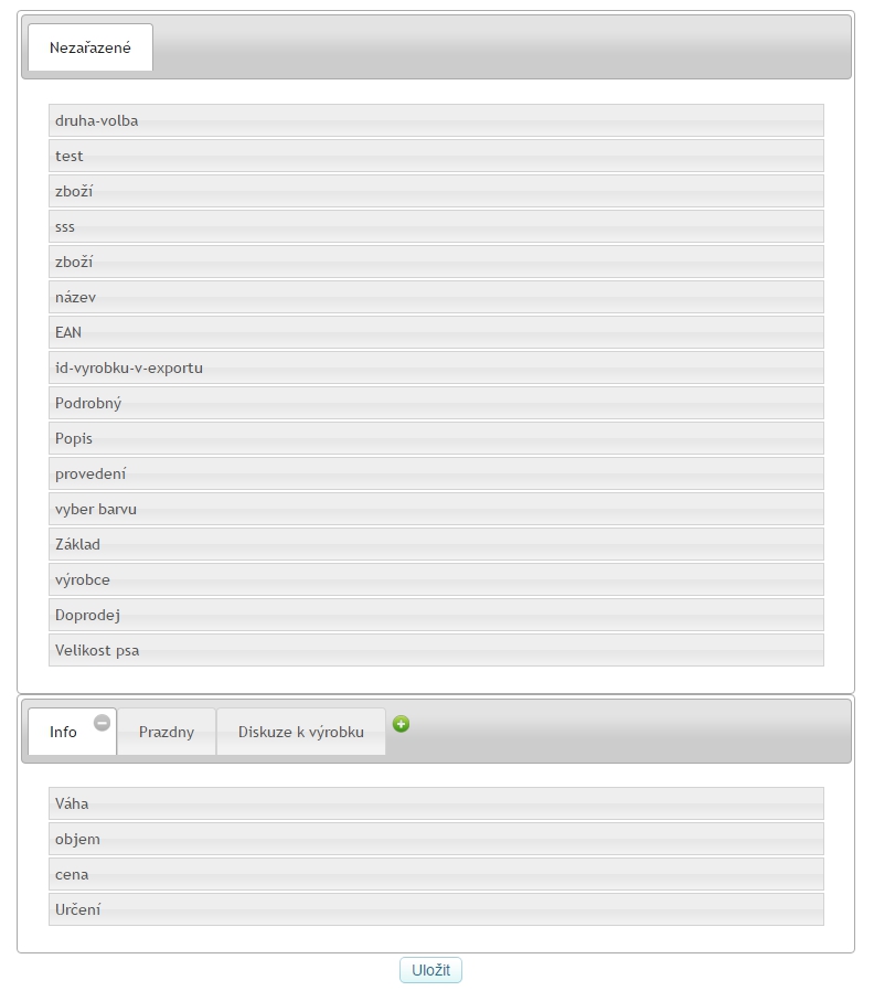 Vytváření panelů - Stačí jednotlivé parametry přetáhnout myší do Vámi vytvořených panelů. Ty vytvoříte klepnutím na tlačítko "+". Naopak talčítekm "-" daný panel smažete i s veškerým jeho obsahem. Které parametry se budou zobrazovat pro dané zboží zase závisí na tom, který parametr je u jednotlivého zboží (v sekci Zboží a kategorie).