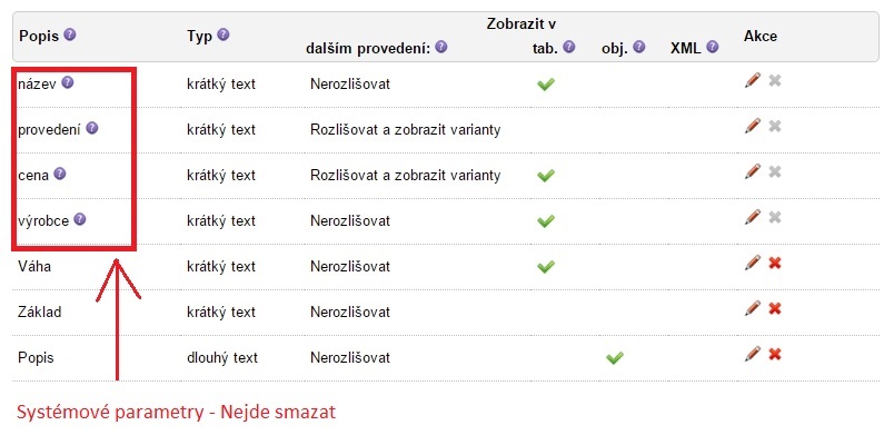 Tabulka na obrázku dole slouží k nastavování, upravování a přidávání parametrů zboží. Jak můžete vidět, některé parametry jsou nesmazatelné. Ovšem lze je nastavit tak, že se nezobrazí a to tak, že všechny možnosti zůstanou prázdné. Jaké parametry si budete chtít zvolit vyberete pomocí možnosti "Upravit parametr zboží" (ikona tužky vedle ikony křížku, která slouží ke smazání parametru). Nápovědu k hlavním atributům tabulky a systémovým parametrům pak zobrazíte najetím kurzoru myši na ikonu fialového otazníku u požadované možnosti. Vložení nového parametru provedete vybráním možnosti "Vložit nový parametr", kde se vám vytvoří nový řádek tabulky. Zde si sami zvolíte vámi potrebné atributy parametru.