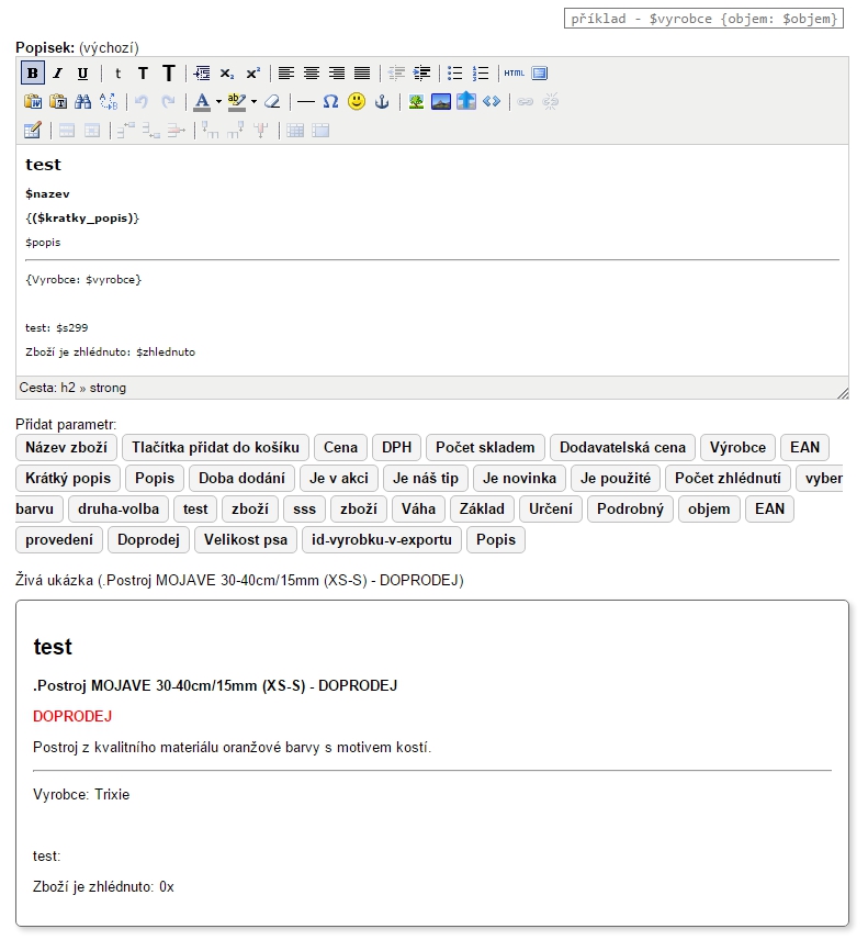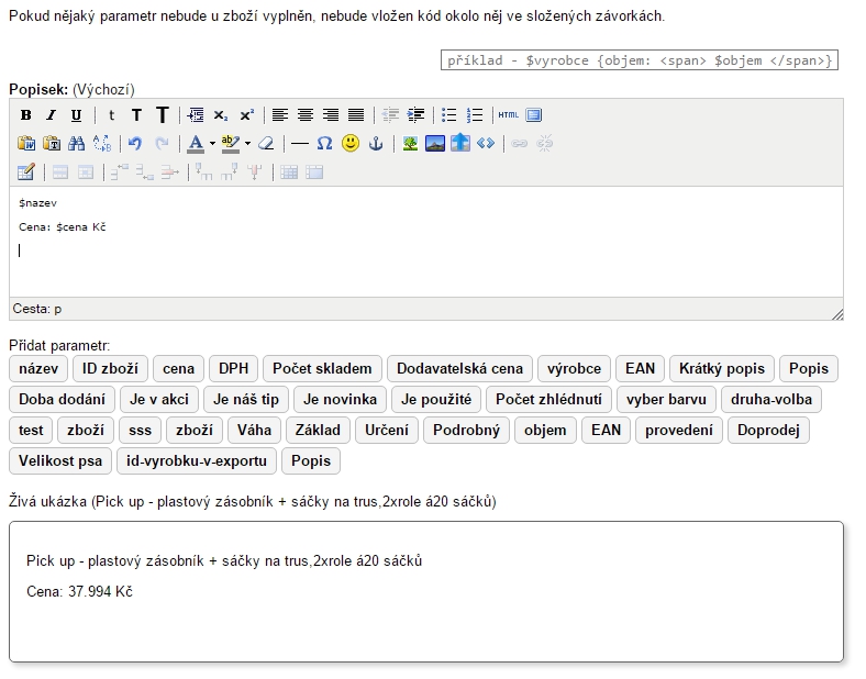 Zde můžete zadat/upravit HTML kód obsahující parametry, které chcete zobrazit ve výpisu zboží