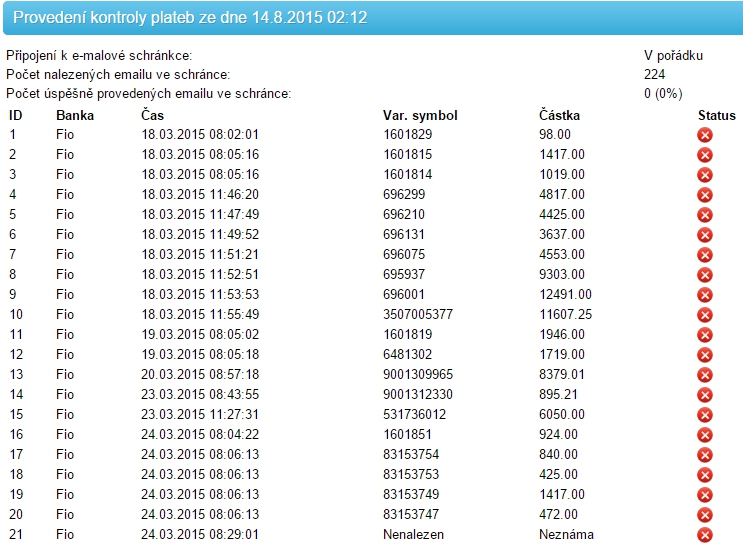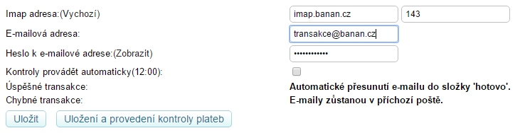 Zde máte možnost nastavit automatickou kontrolu plateb. Pro automatickou kontrolu platby je nutné si vytvořit e-mailovou schránku (doporučuji používat jenom na přijaté transakce). Poté je nutné si tuto e-mailovou schránku nastavit ve Vašem bankovnictví, tak aby se přijaté transakce automaticky posílali na tuto e-mailovou schránku.