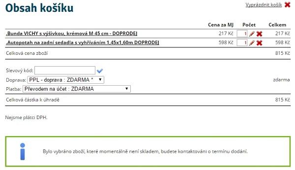 Jako zákazník zvolíte u výpisu zboží "Do košíku". Zboží je tím pádem přesunuto do virtuálního košíku, kde máte uložený jeho výběr. Takto to můžete udělat u každého zboží, které chcete objednat a cena košíku se Vám pěkně sečte.