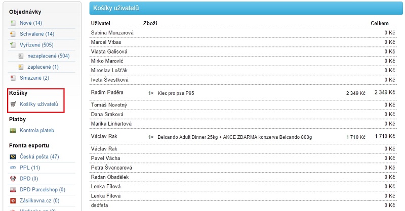 V této sekci se můžete podívat, jaké produkty si dávají Vaši zákazníci do košíku. Máte zde přehled který uživatel si přidal které zboží do košíku a celkovou částku.
