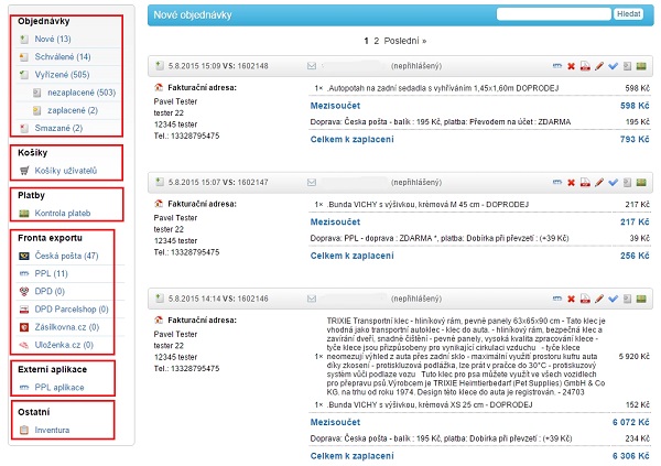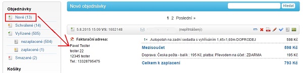 Implicitně se zobrazí okno nových objednávek po zvolení této sekce.