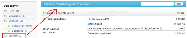 Přehled všech smazaných objednávek. Jakmile již nějakou objednávku smažete, nelze ji již obnovit !