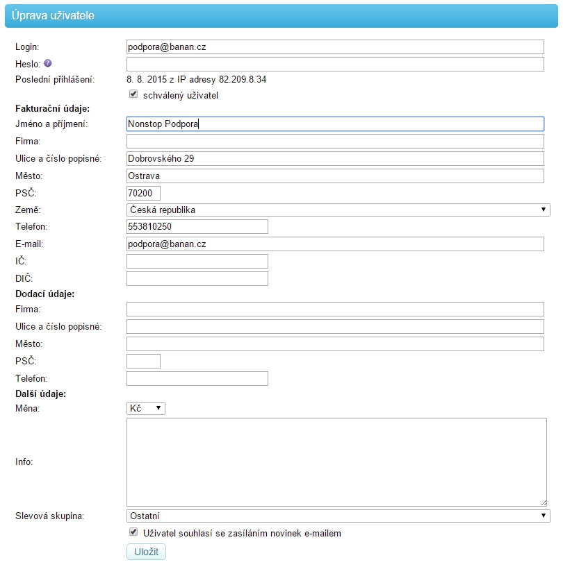 Zde můžete upravovat uživatele, pokud jsme klikni na ikonu tužky, nebo na jméno uživatele ve výpisu registrovaných.