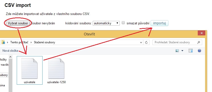 Zde můžete importovat uživatele z vlastního souboru CSV. Je zde možnost smazat dosavadní uživatele.