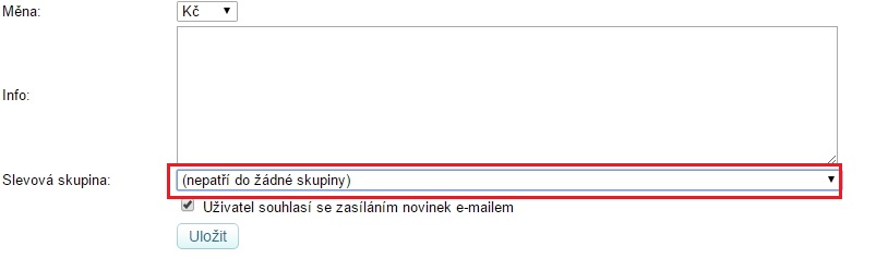 Pokud bychom chtěli nějakého uživatele přidat do slevové skupiny, provedeme to přes editaci, jak je popsáno výše v nápovědě, viz obrázek: