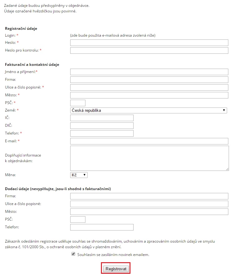Kliknutím na Registrovat je uživatel zaregistrovaný. Pokud uživatel souhlasí se zasíláním novinek (zaškrtnul