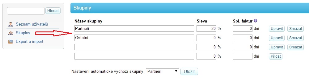 Vytvoření slevové skupiny je, jak sami můžete vidět, velmi jednoduché. Stačí vepsat název skupiny, slevu v procentech a splatnost faktury (pokud necháte prázdné, použije se výchozí hodnota, kterou máte nastavenou) a tlačítkem Přidat potvrdíte. Dále můžete slevové skupiny upravovat či mazat.